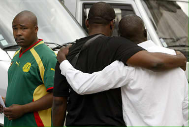 Des supporters de l'équipe nationale du Cameroun quittent, le 03 juillet 2003 la cathédrale Saint-Jean de Lyon, à l'issue de la messe de funérailles du footballeur camerounais Marc-Vivien Foé