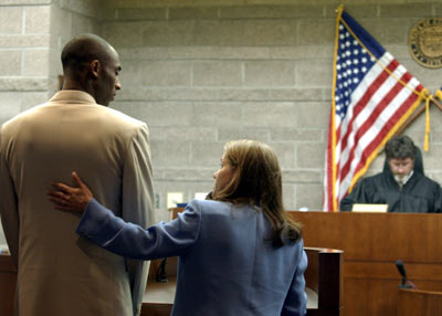 Kobe Bryant se concerte avec son avocate, Pamela Mackey.