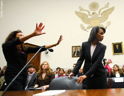 Une femme avec les mains teintées en rouge s'est précipité vers Condoleezza Rice la semaine dernière (mercredi 24 octobre) alors que la secrétaire d'Etat aux affaires étrangères s'apprêtait à témoigner devant le congrès américain.