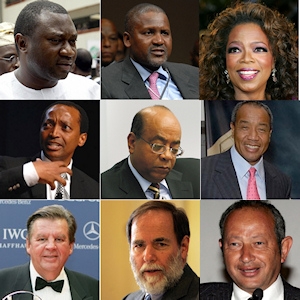 ![]() De gauche à droite et de haut en bas : Femi Otedola, Aliko Dangote, Oprah Winfrey, Patrice Motsepe, Mo Ibrahim, Michael Lee Chin, Johann Rupert, Nicky Oppenheimer, Naguib Sawiris | ||||||||||||