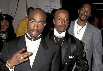 Tupac en compagnie de Mc Hammer et de Snoop Dogg lors des American Music Awards le 29 janvier 1996 à Los Angeles | ||||||||||||