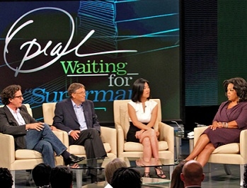 Davis Guggenheim, réalisateur du documentaire, Michelle Rhee directrice d'écoles publiques à Washington et Bill Gates sur le plateau d'Oprah Winfrey le 20 septembre 2010 | ||||||||||||