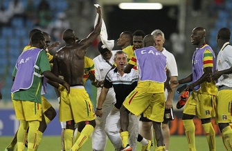 Les joueurs maliens célèbrent leur troisième place avec leur coach Alain Giresse