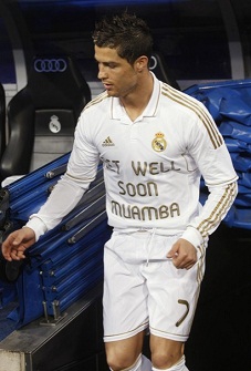 Cristiano Ronaldo vêtu d'un maillot comportant un message de soutien à Fabrice Muamba lors du match face à Malaga le 18/3/12 | ||||||||||||||||||||||||||||||