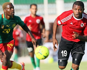 L'attaquant libyen Ahmed Zuway face au défenseur camerounais Georges Mandjek | ||||||||||||