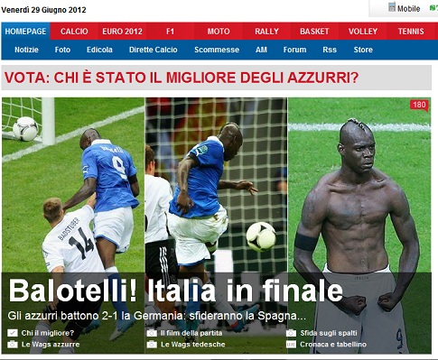 | Mario Balotelli a choisi le meilleur moment pour exploser devant le grand public. Si l'attaquant italien, surnommé "Super Mario" était déjà largement connu des fans de football, le grand public l'a certainement découvert jeudi soir (28/6/12) avec ses deux buts marqués face à l'Allemagne. Balotelli a ouvert la marque à la 20ème minute de la tête suite à un centre d'Antonio Cassano, et a récidivé à la 36ème minute d'une frappe lourde en pleine lucarne, après avoir récupéré une passe de Riccardo Montolivo. Largement dominée par l'Italie, l'Allemagne était méconnaissable. Si les Allemands se sont procurés deux occasions dans le premier quart d'heure, ils n'ont jamais inquiété par la suite l'Italie dont la victoire est amplement méritée. Balotelli a déclaré avoir réalisé le "meilleur match de carrière" et est allé embrasser Silvia, sa mère adoptive en lui disant: "ces buts sont pour toi." L'attaquant italien a déclaré à la presse : "J'ai attendu ce moment si longtemps et je voulais rendre ma mère heureuse. Le match de ce soir [jeudi soir NDLR] a été le meilleur match de ma vie et j'espère que celui de dimanche sera encore mieux". L'Italie affrontera l'Espagne, champion d'Europe et Champion du monde en titre lors de la finale dimanche.