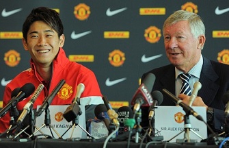 Alex Ferguson, emblématique manager du club anglais de Manchester United accueille le japonais Shinji Kagawa, nouvelle recrue le 12 juillet 2012 | ||||||||||||