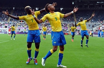 Pierre Aymeric Aubameyang célèbre le but gabonais face à la Suisse le 26 juillet 2012 lors du tournoi olympique | ||||||||||||