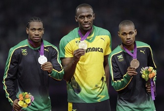 De g à d : Yohan Drake, Usain Bolt et Warren Weir. Triplé jamaïcain sur 200 mètres aux jeux olympiques | ||||||||||||