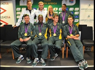 L'équipe olympique sud-africaine de g à d : Chad le Clos, Cameron van der Burgh, Bridgitte Hartley, Caster Semenya, Matthew Brittan, Sizwe Ndlovu, John Smith et James Thompson | ||||||||||||