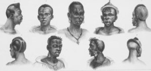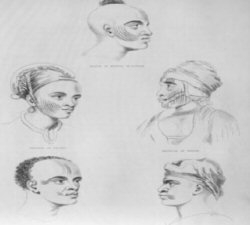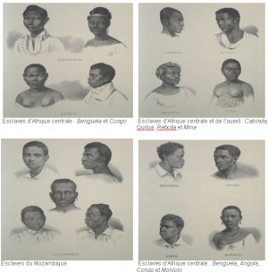 ![]() Dans le sens des aiguilles d'une montre: Esclaves d’Afrique centrale :Benguela et Congo. Esclaves d’Afrique centrale et de l'ouest: Cabinda, Quiloa, Rebolla et Mina. Esclaves d'Afrique centrale : Benguela, Angola, Congo et Moniolo. Esclaves du Mozambique | ||||||||||||