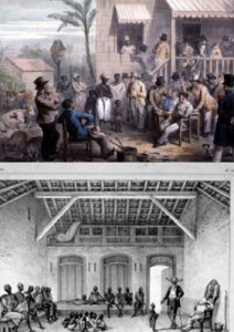 ![]() En haut Marché d'esclaves, Rio de Janeiro, Brésil, 1830; en bas vente d'une femme et de ses enfants (Surinam) | ||||||||||||